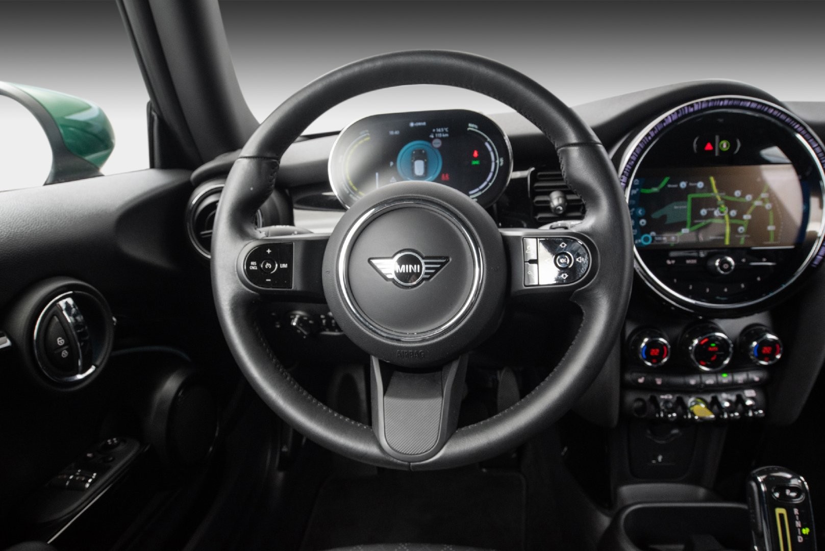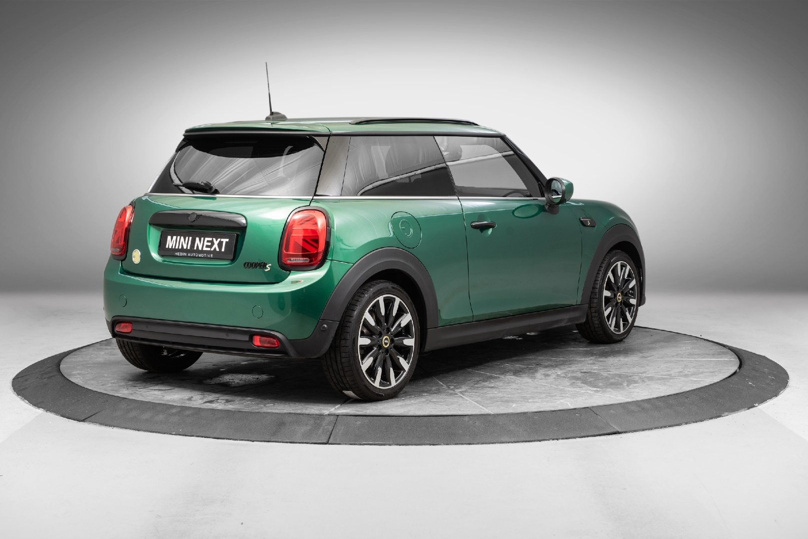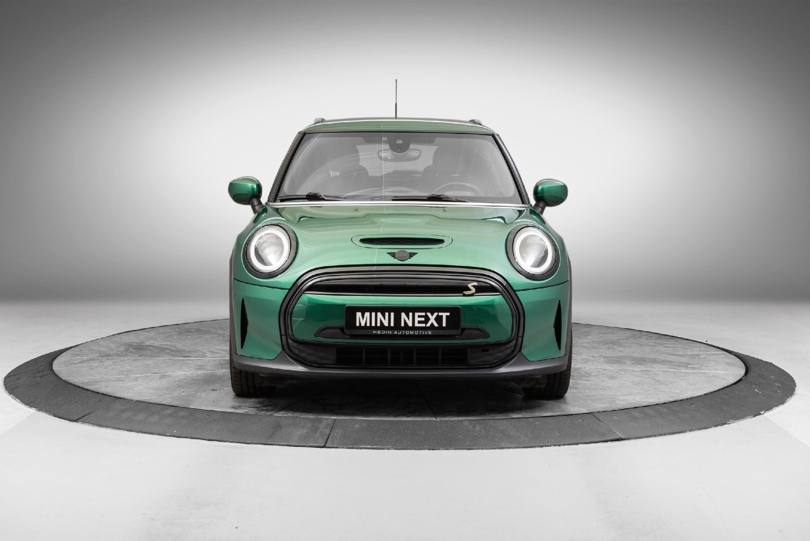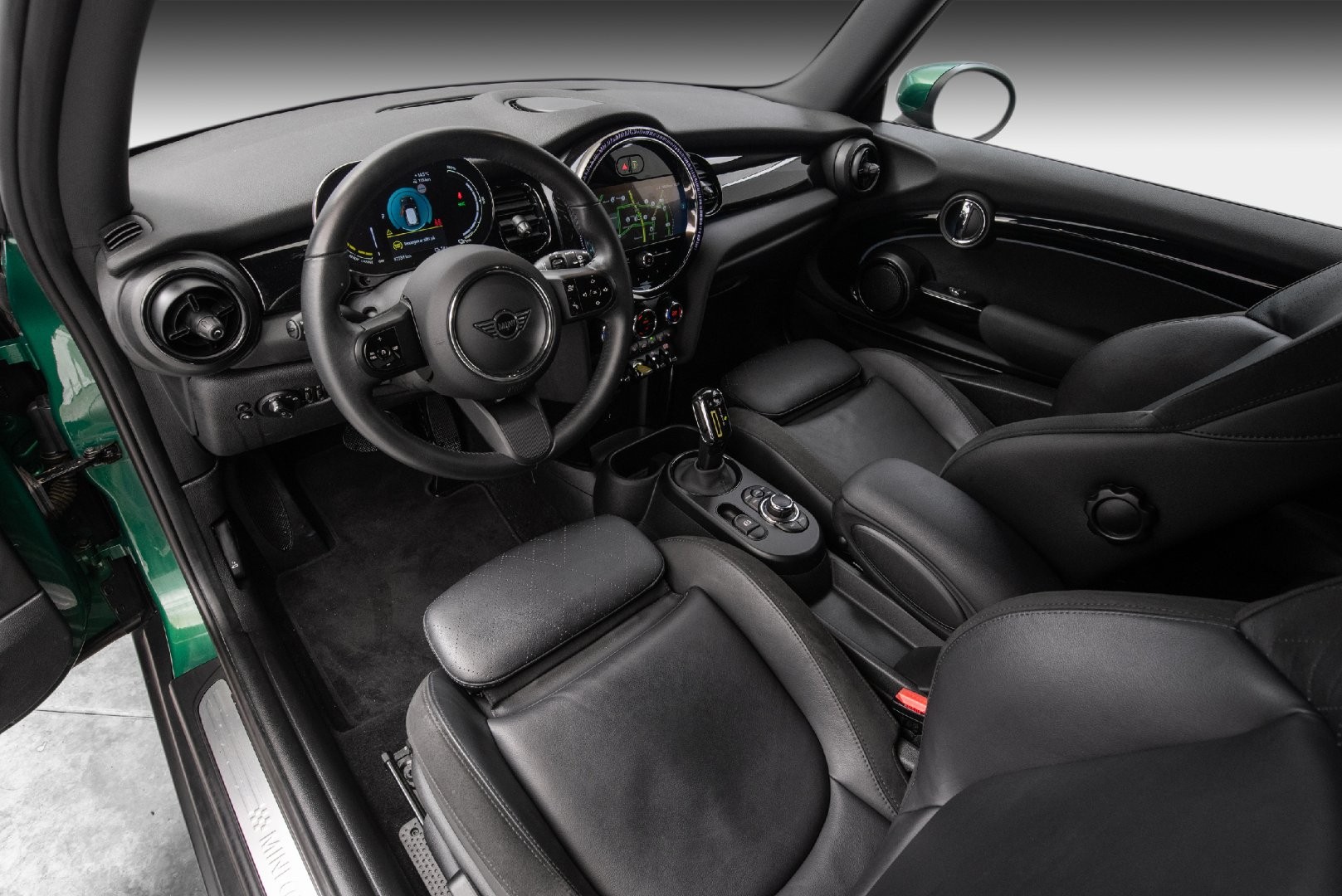 Knalltøff MINI Cooper SE i fargen British Racing Green Metallic. Står klar til omgående levering