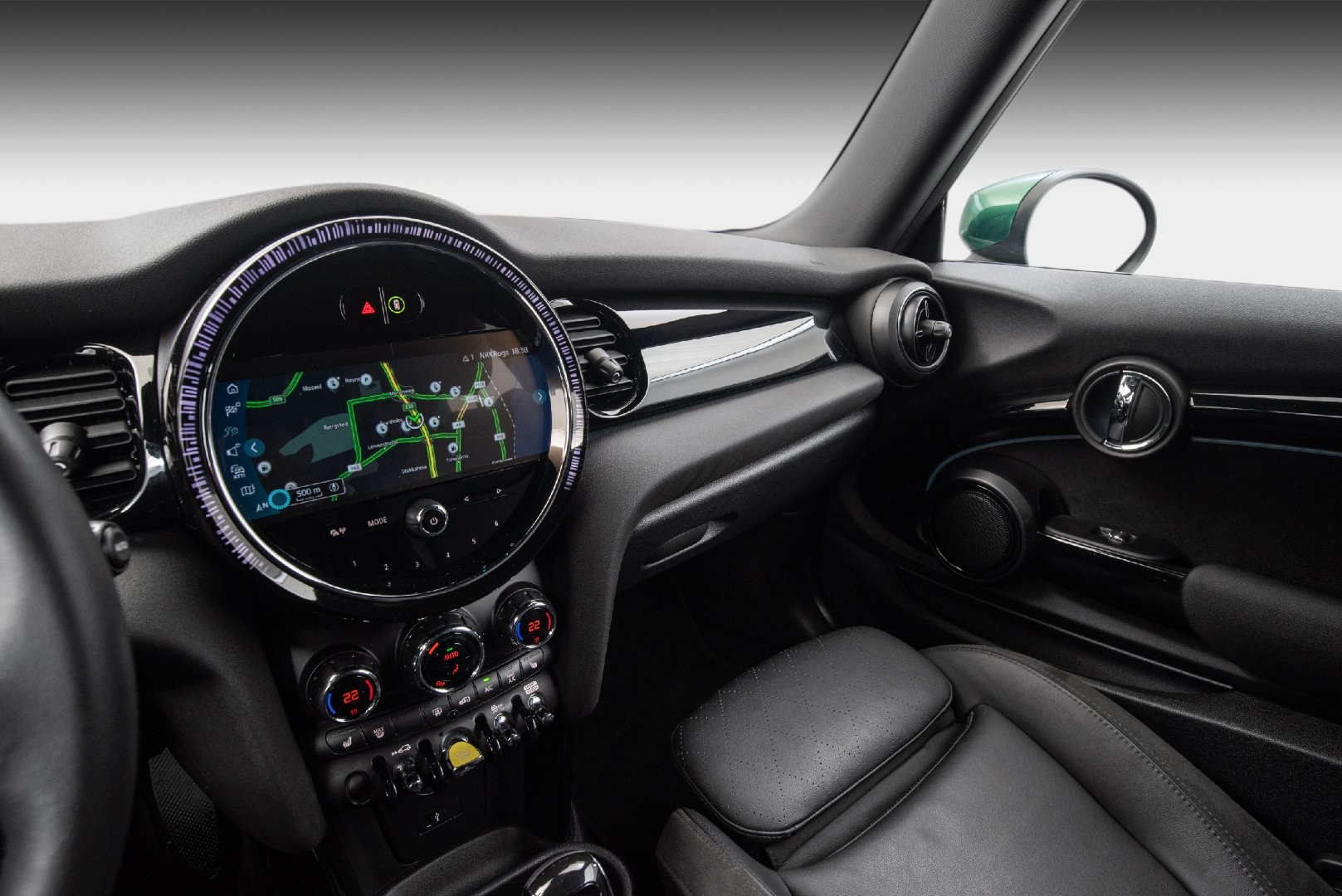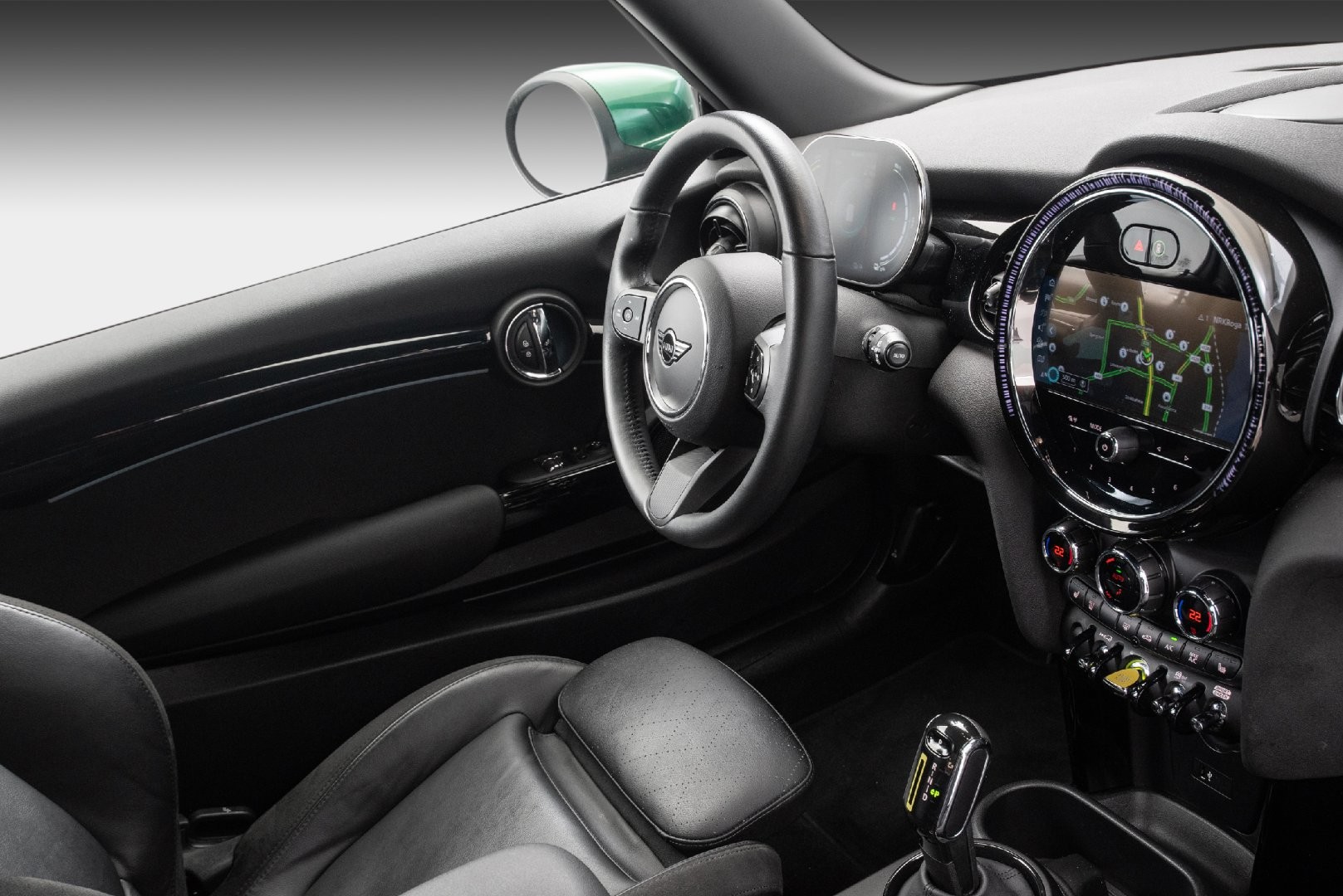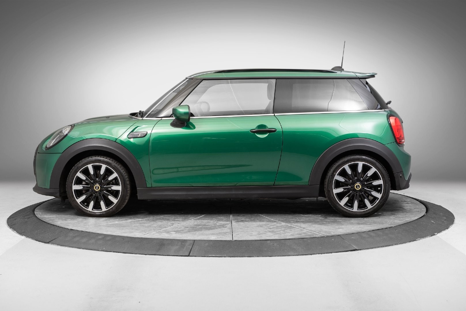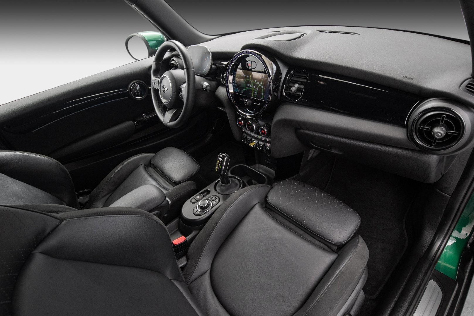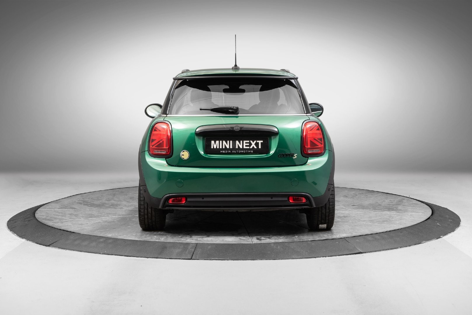 Knalltøff MINI Cooper SE i fargen British Racing Green Metallic. Står klar til omgående levering