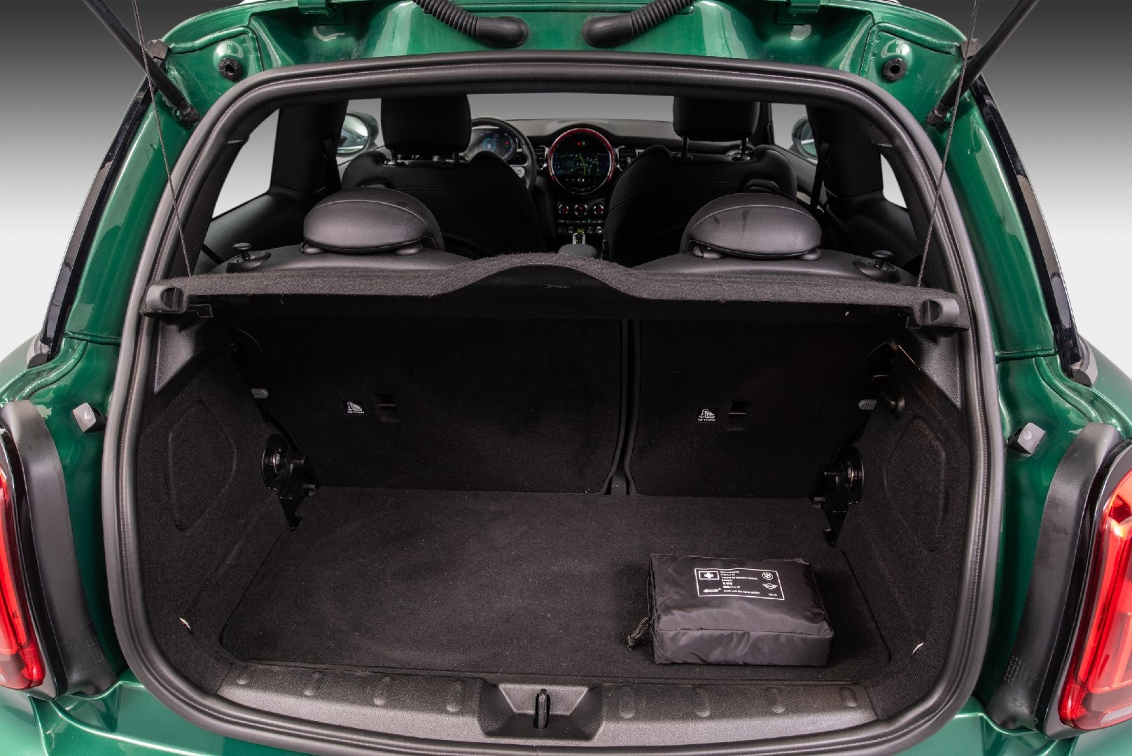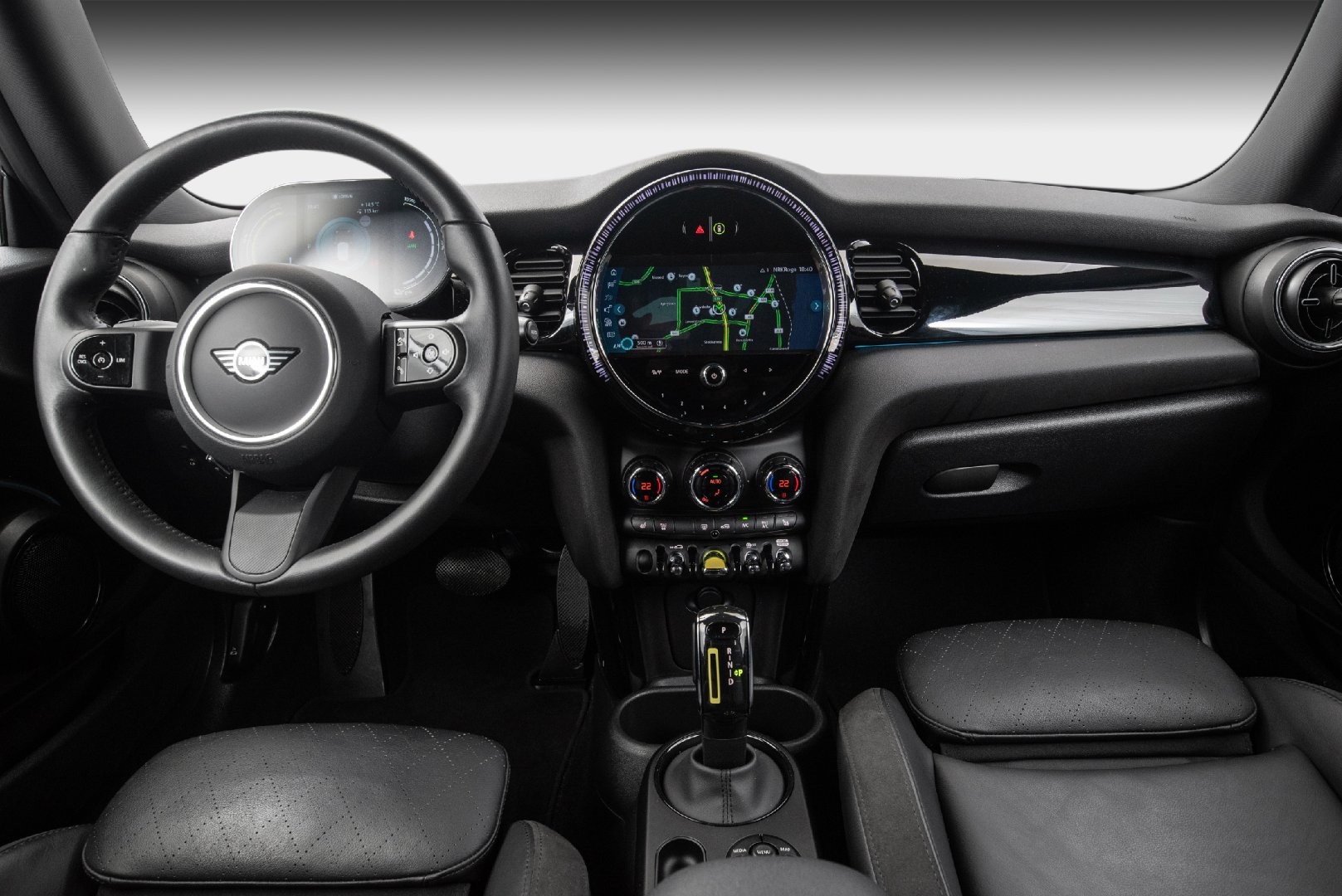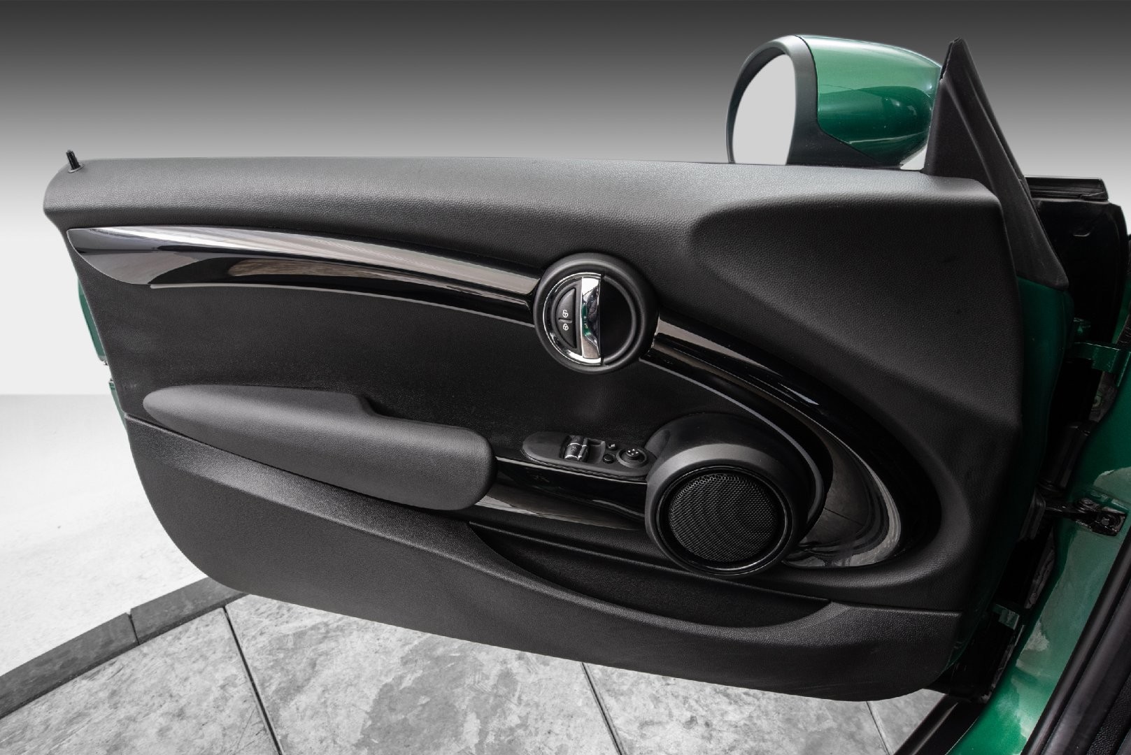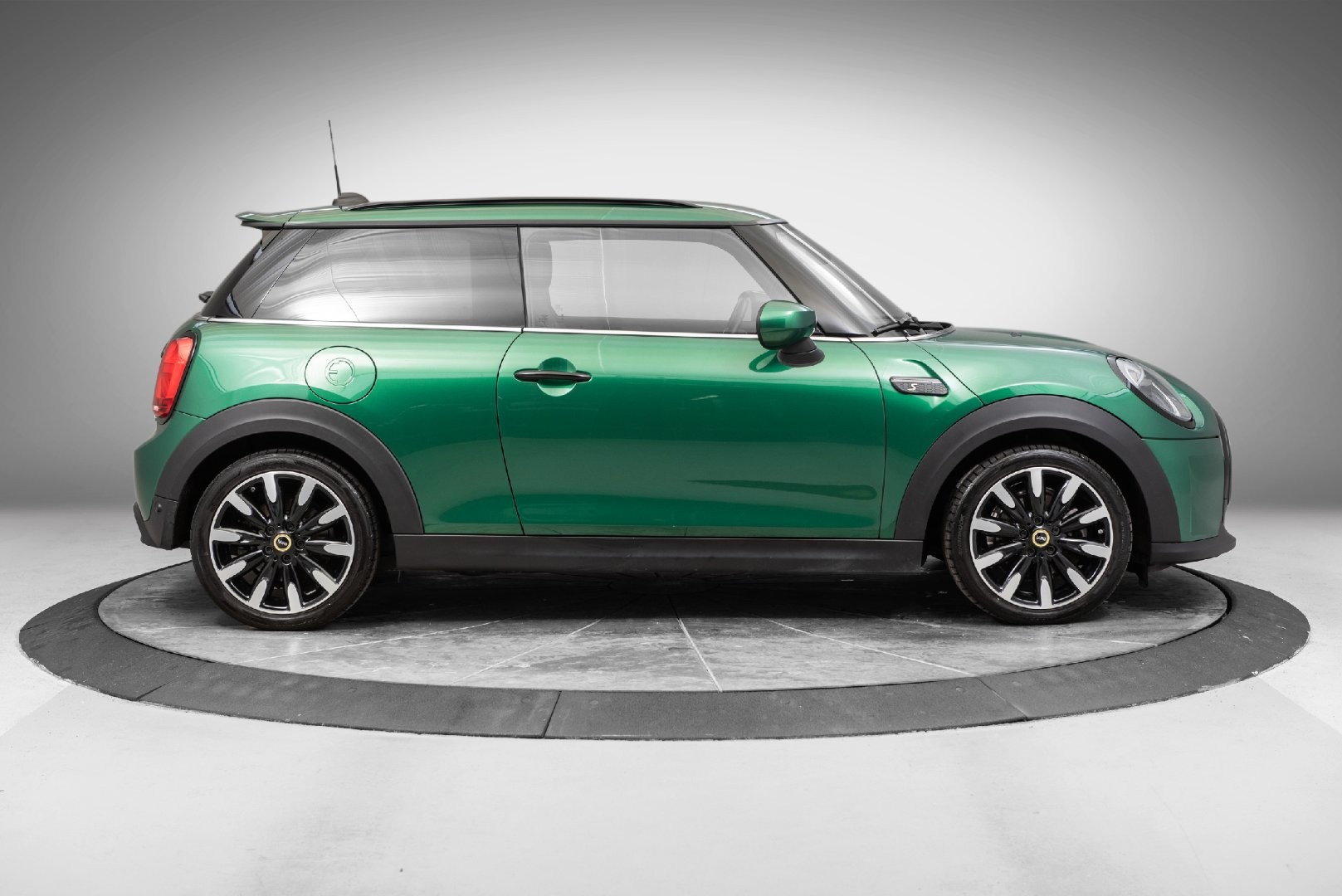 Knalltøff MINI Cooper SE i fargen British Racing Green Metallic. Står klar til omgående levering